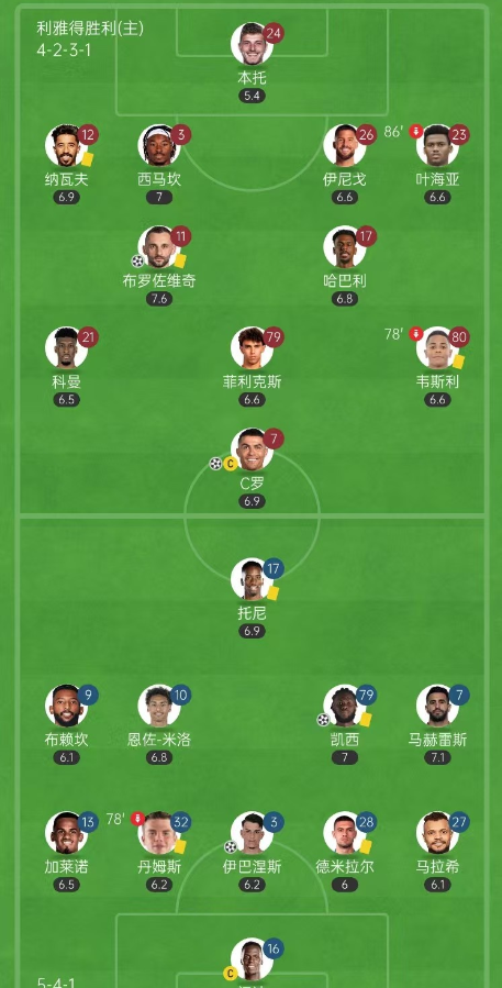 利雅得胜利首发:24-本托、12-纳瓦夫-布歇尔、3-西马坎、26-伊尼戈-马丁内斯、23-艾曼-叶海亚、17-阿卜杜拉-海巴里、11-布罗佐维奇、79-菲利克斯、21-金斯利-科曼、80-韦斯利-特谢拉、7-C罗